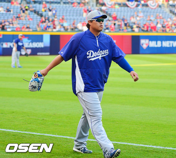 4일 (이하 한국시간) 미국 조지아 애틀랜타 터너필드에서 열린 2013 메이저리그 애틀랜타 브레이브스와 LA 다저스의 내셔널리그 디비전시리즈(5전3선승제) 1차전, 경기 전 다저스 류현진이 훈련을 마치고 덕아웃으로 향하고 있다.
