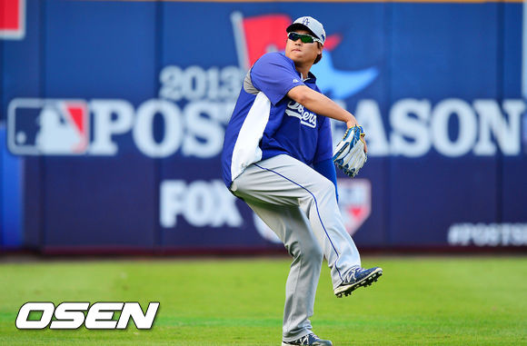 4일 (이하 한국시간) 미국 조지아 애틀랜타 터너필드에서 열린 2013 메이저리그 애틀랜타 브레이브스와 LA 다저스의 내셔널리그 디비전시리즈(5전3선승제) 1차전, 경기 전 다저스 류현진이 캐치볼 훈련을 하고 있다.