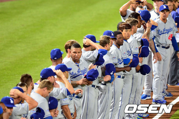 4일 (이하 한국시간) 미국 조지아 애틀랜타 터너필드에서 열린 2013 메이저리그 애틀랜타 브레이브스와 LA 다저스의 내셔널리그 디비전시리즈(5전3선승제) 1차전, 경기 전 다저스 류현진이 동료들과 도열해있다.