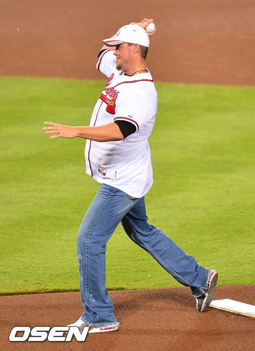 4일 (이하 한국시간) 미국 조지아 애틀랜타 터너필드에서 열린 2013 메이저리그 애틀랜타 브레이브스와 LA 다저스의 내셔널리그 디비전시리즈(5전3선승제) 1차전, 애틀랜타 브레이브스 은퇴선수 치퍼 존스가 시구를 하고 있다. 치퍼 존스는 최고의 스위치히터로 20년 가까이 오직 애틀랜타 브레이브스에서만 활약하며 영구 결번됐다.