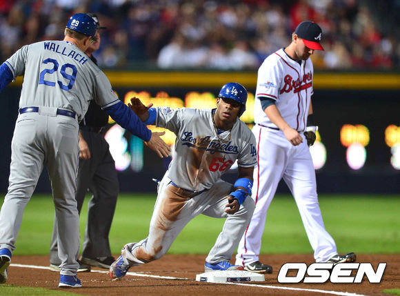 4일 (이하 한국시간) 미국 조지아 애틀랜타 터너필드에서 열린 2013 메이저리그 애틀랜타 브레이브스와 LA 다저스의 내셔널리그 디비전시리즈(5전3선승제) 1차전, 2회초 1사 1루 다저스 유리베의 안타때 1루 주자 푸이그가 3루에 세이프된 후 왈라치 코치와 하이파이브를 하고 있다.