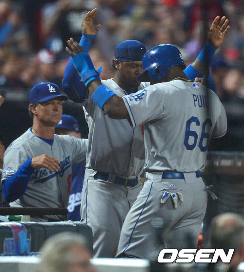 4일 (이하 한국시간) 미국 조지아 애틀랜타 터너필드에서 열린 2013 메이저리그 애틀랜타 브레이브스와 LA 다저스의 내셔널리그 디비전시리즈(5전3선승제) 1차전,2회초 다저스 슈마커의 희생플라이때 선취득점을 올린 3루 주자 푸이그가 라미레스의 축하를 받고 있다.