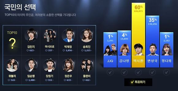 4일 오전 현재 '국민의 선택' 투표에는 총 37만 7000여명이 참여한 가운데 박시환이 이중 과반수를 넘는 22만 6000여표(60%)를 획득하며 톱10 확정이 유력시됐다. 이 뒤를 13만여표를 얻은 변상국이 뒤따르고 있다.