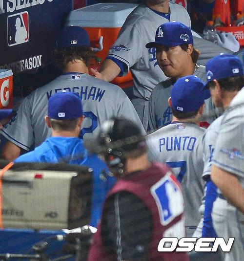 4일 (이하 한국시간) 미국 조지아 애틀랜타 터너필드에서 열린 2013 메이저리그 애틀랜타 브레이브스와 LA 다저스의 내셔널리그 디비전시리즈(5전3선승제) 1차전,3회말 위기는 넘긴 다저스 선발투수 커쇼가 이닝종료 후 더그아웃에서 류현진의 격려를 받고 있다