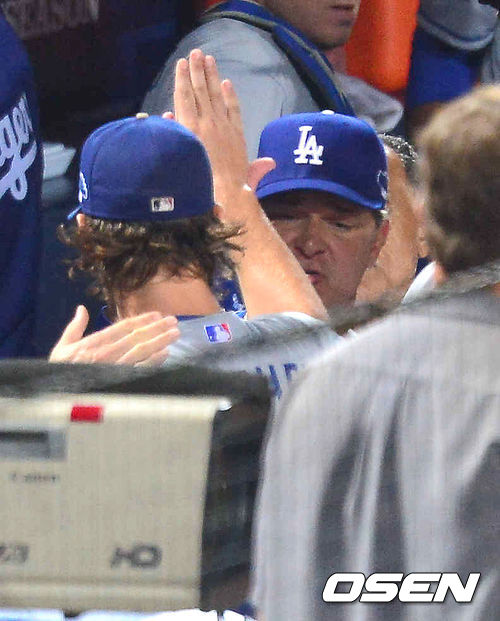 4일 (이하 한국시간) 미국 조지아 애틀랜타 터너필드에서 열린 2013 메이저리그 애틀랜타 브레이브스와 LA 다저스의 내셔널리그 디비전시리즈(5전3선승제) 1차전, 7회말 이닝종료 후 다저스 선발투수 커쇼가 매팅리 감독의 축하를 받고 있다. 커쇼는 7이닝 1실점 호투하며 승리투수 조건을 갖췄다.