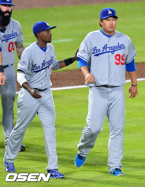 경기를 마치고 다저스 디 고든이 덕아웃을 뛰쳐나가며 류현진과 얘기를 나누고 있다 / rumi@osen.co.kr