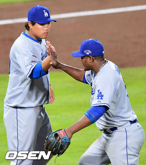 경기를 마치고 다저스 류현진이 후안 유리베와 하이파이브를 하고 있다../ rumi@osen.co.kr