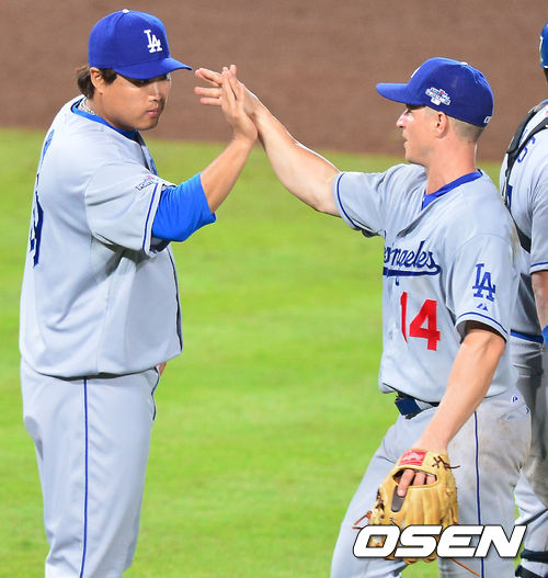 경기를 마치고 류현진이 마크 엘리스와 하이파이브를 하고 있다. / rumi@osen.co.kr