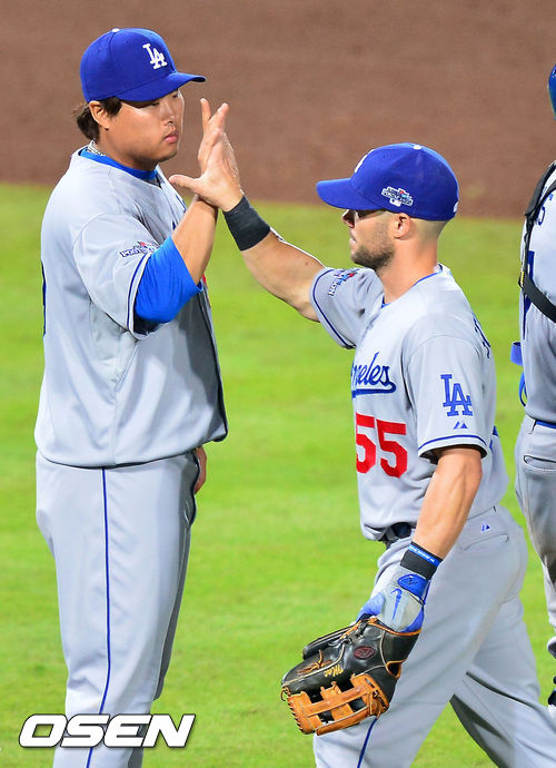 경기를 마치고 다저스 류현진이 스킵 슈마커와 하이파이브를 하고 있다. / rumi@osen.co.kr