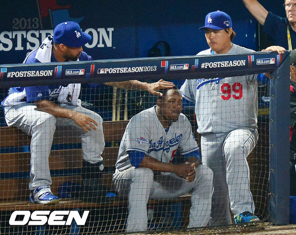 8회 덕아웃에서 류현진과 맷 켐프가 후안 유리베의 머리와 어깨를 만지고 있다. / rumi@osen.co.kr
