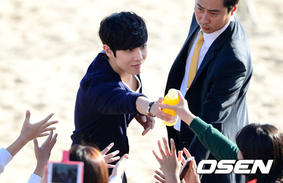 배우 이준이 팬들에게 음료수를 건네고 있다.