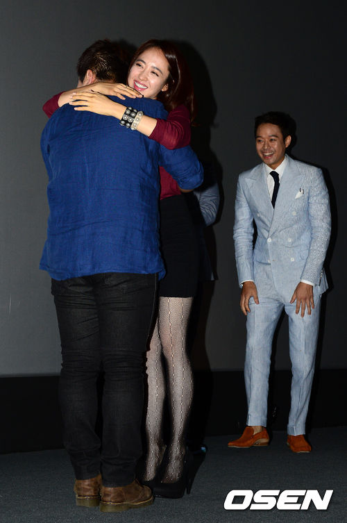 배우 김민정이 무대에 올라 팬과 포옹을 하며 즐거워하고 있다.