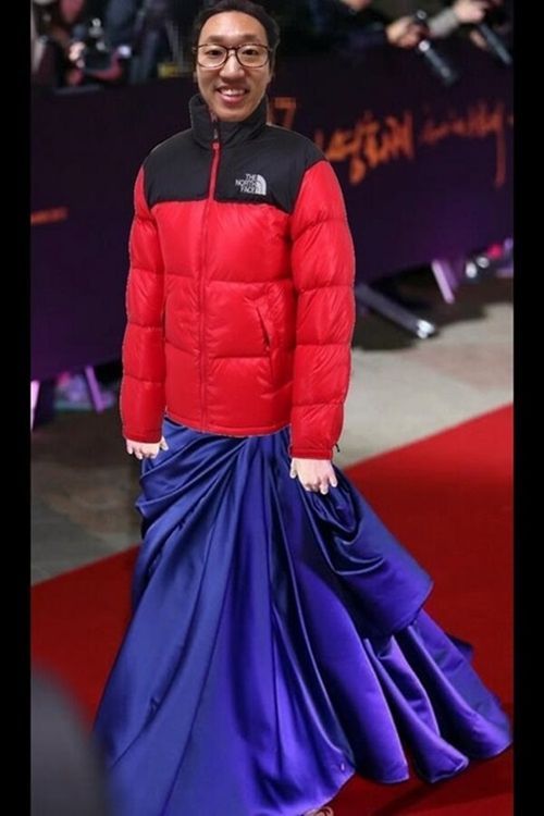 사진은 레드카펫에서 드레스를 입고 서 있는 여배우에 겨울 점퍼를 입은 김경진을 합성한 모습을 담고 있다. 웃기지만 메시지가 있는 풍자에 가깝다.