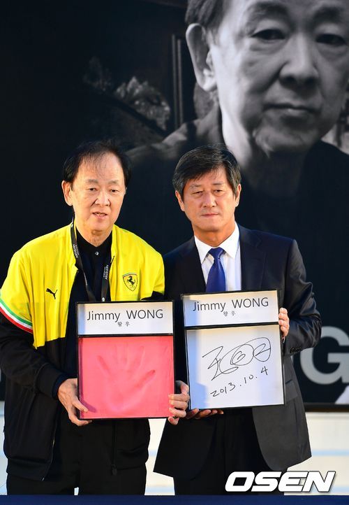 왕우가 핸드프린팅 행사를 마치고 이용관 집행위원장과 포토타임을 갖고 있다.