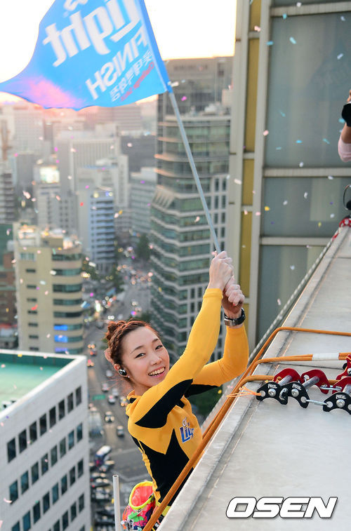 4일 오후 서울 롯데백화점 본점 에비뉴엘 빌딩을 오르는 '카스라이트 빌더링 2 with 김자인'행사에서 김자인이 완등 후 포토타임을 갖고 있다.