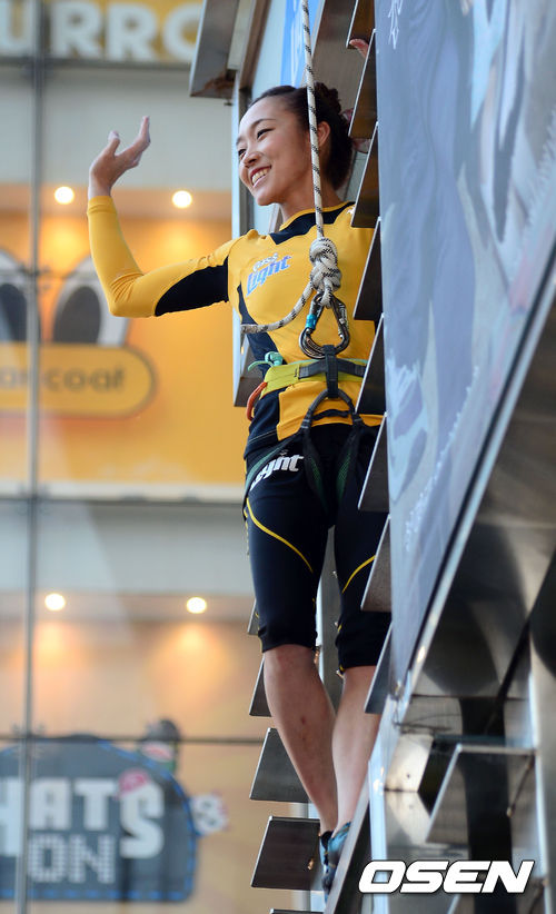4일 오후 서울 롯데백화점 본점 에비뉴엘 빌딩을 오르는 '카스라이트 빌더링 2 with 김자인'행사에서 김자인이 팬들에게 인사를 하고 있다.