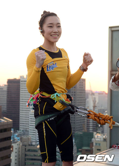 4일 오후 서울 롯데백화점 본점 에비뉴엘 빌딩을 오르는 '카스라이트 빌더링 2 with 김자인'행사에서 김자인이 완등 후 포토타임을 갖고 있다.