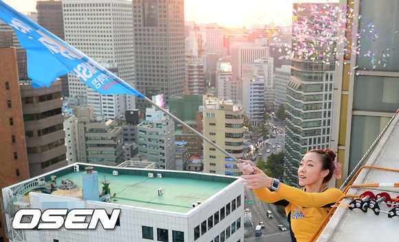 4일 오후 서울 롯데백화점 본점 에비뉴엘 빌딩을 오르는 '카스라이트 빌더링 2 with 김자인'행사에서 김자인이 완등 후 포토타임을 갖고 있다.