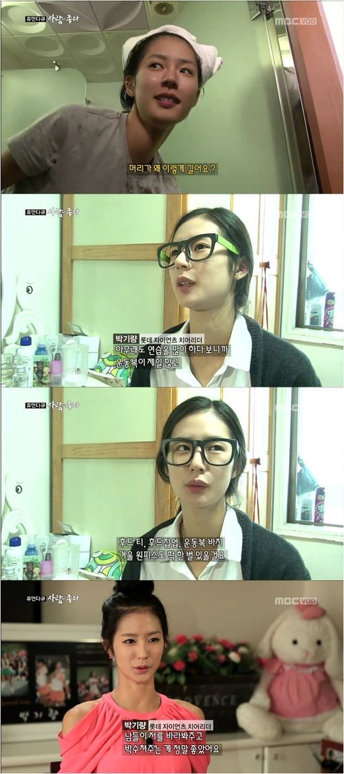 이날 박기량 씨는 긴 머리를 빨래 빨듯 감고, 떨어진 머리카락을 대충 줍는 등 털털한 모습을 보이기도 했다. 또한 원정 경기에서 대기실이 없어 화장실에서 피자를 먹거나, 성형 의혹에 대해 해명하는 시간을 가졌다.