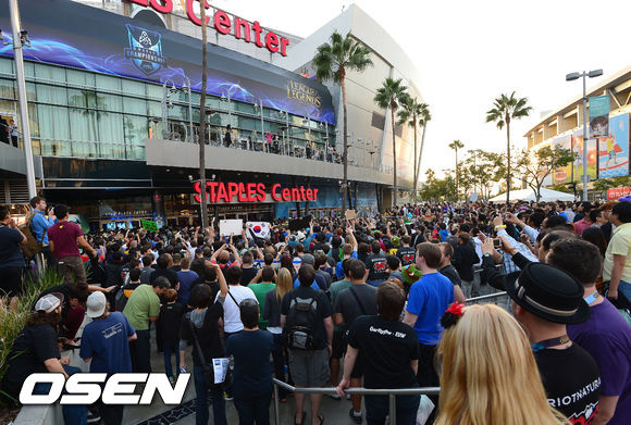4일 (이하 한국시간) 미국 캘리포니아 로스앤젤레스의 스테이플스 센터에서 'LOL 시즌3 월드챔피언십(이하 롤드컵)' 결승전, 한국팀 SK텔레콤 T1과 로얄클럽 황주의 경기가 열릴 예정인 가운데 수많은 팬들이 모여 있다.