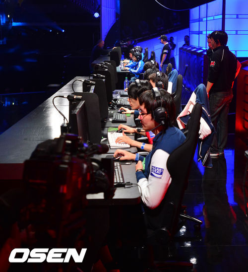 4일 (이하 한국시간) 미국 캘리포니아 로스앤젤레스의 스테이플스 센터에서 'LOL 시즌3 월드챔피언십(이하 롤드컵)' 결승전, 한국팀 SK텔레콤 T1과 로얄클럽 황주의 경기가 열릴 예정인 양팀 선수들이 게임을 플레이하고 있다.