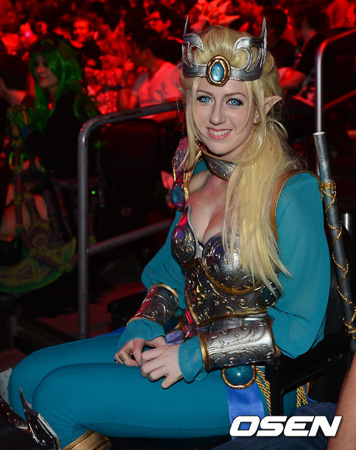 4일 (이하 한국시간) 미국 캘리포니아 로스앤젤레스의 스테이플스 센터에서 'LOL 시즌3 월드챔피언십(이하 롤드컵)' 결승전, 한국팀 SK텔레콤 T1과 로얄클럽 황주의 경기가 열릴 예정인 잔나 코스프레를 한 팬이 경기를 지켜보고 있다.