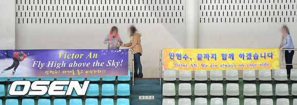 경기전 팬들이 안현수(빅토르 안)를 응원하는 현수막을 걸고 있다.