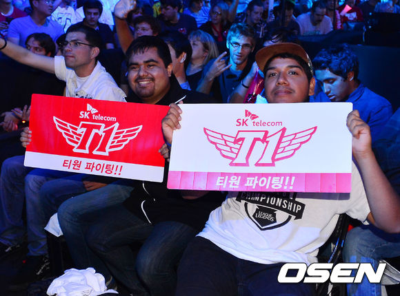 4일 (이하 한국시간) 미국 캘리포니아 로스앤젤레스의 스테이플스 센터에서 'LOL 시즌3 월드챔피언십(이하 롤드컵)' 결승전, 한국팀 SK텔레콤 T1과 로얄클럽 황주의 경기가 열릴 예정인 SKT를 응원하는 팬들이 환하게 미소짓고 있다.