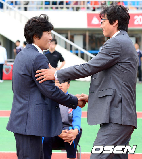 경기에 앞서 수원 서정원 감독과 포항 황선홍 감독이 악수를 나누고 있다.