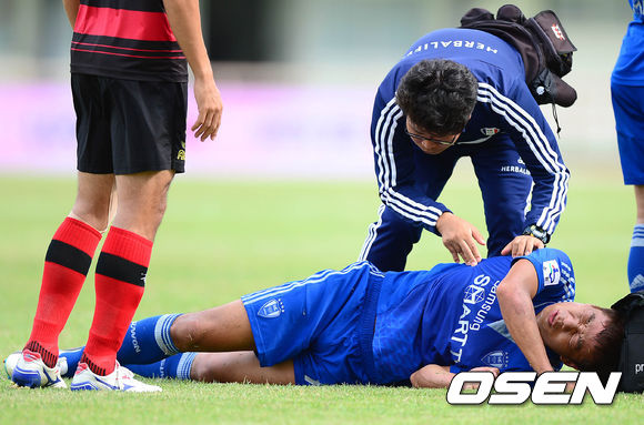 전반 공중볼 다툼중 상대 수비와 충돌한 수원 염기훈이 고통스러워하고 있다.