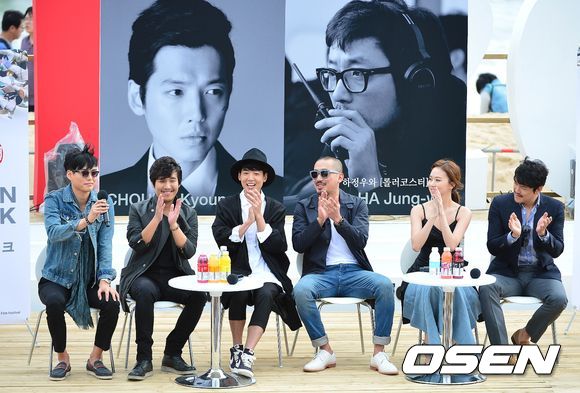 5일 오후 부산 해운대 비프빌리지 야외무대서 열린 영화 '롤러코스터'(감독 하정우) 오픈토크에 참석한 배우들과 하정우가 인사말을 전하고 있다.