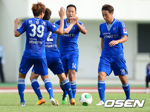 후반 수원 정대세가 동점골을 성공시키고 동료들과 환호하고 있다.