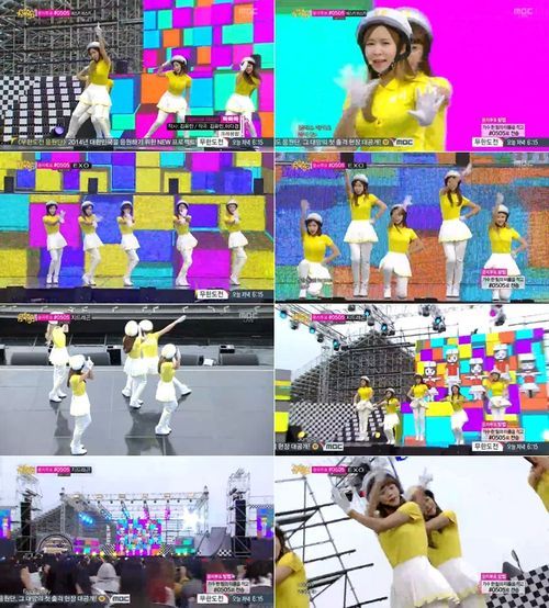 크레용팝은 노란색 트레이닝복에 스커트, 그리고 트레이드마크인 헬멧을 쓰고 등장해 포인트 안무인 직렬5기통 춤 등 중독성 강한 무대를 꾸몄다.