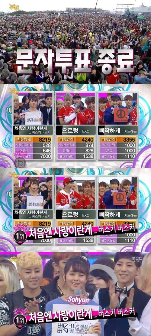 버스커버스커는 신곡 '처음엔 사랑이란게'로 5일 오후 전라남도 영암에서 생방송으로 진행된 MBC '영암 F1특집, 쇼! 음악중심'(이하 '음악중심')에 1위 후보에 올라 엑소 '으르렁', 지드래곤 '삐딱하게'를 제치고 1위 왕자를 차지했다.