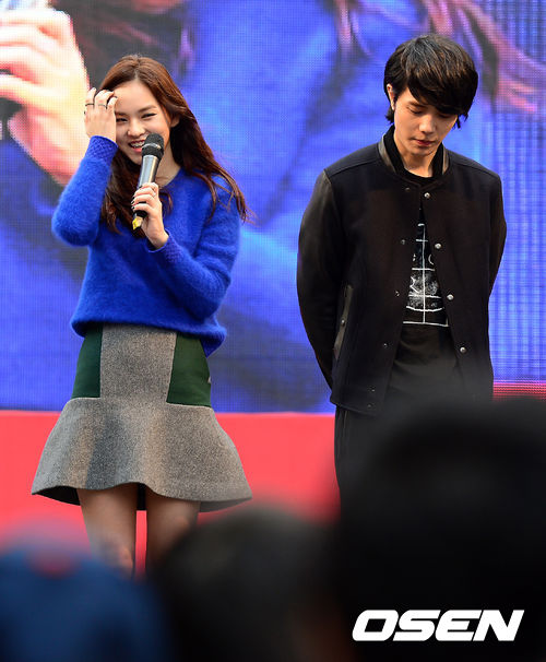 5일 오후 부산 남포동 비프광장에서 열린 '제 18회 부산국제영화제(BIFF)' 영화 '소녀' 야외무대인사에서 배우 김윤혜, 김시후가 팬들에 인사를 하고 있다.