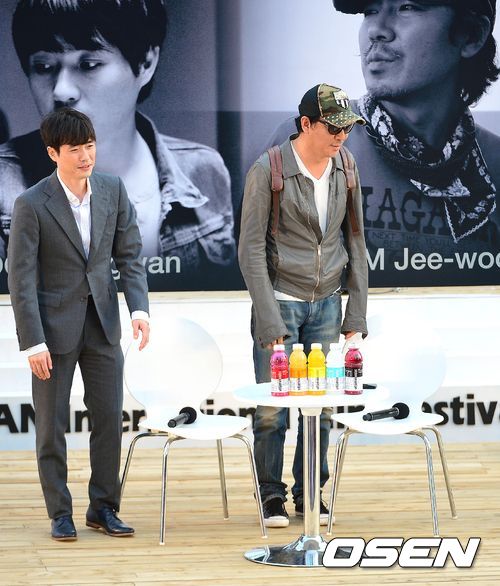 김지운-류승완 감독이 5일 오후 부산 해운대 비프빌리지 야외무대서 열린 '김지운, 류승완의 액션 썰전' 오픈토크에 참석해 인사하고 있다.