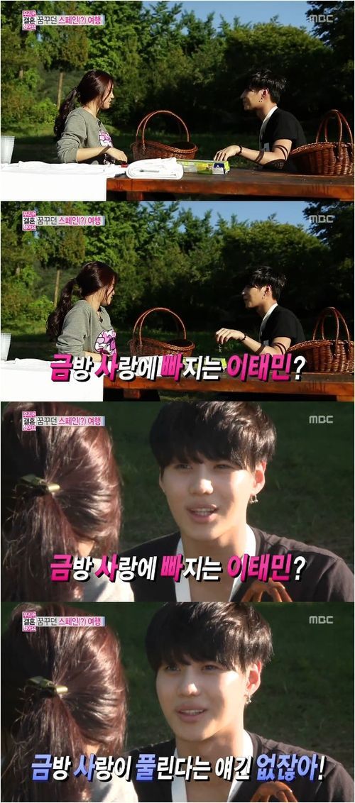 태민은 “금방 사랑에 빠진다고 해서 금방 식는다는 것은 아니지 않잖아”라고 대응했다. 이어 그는 “넌 오래 사랑에 빠지는 사람이다. 오사빠”라고 닭살스러운 말을 이어갔다.
