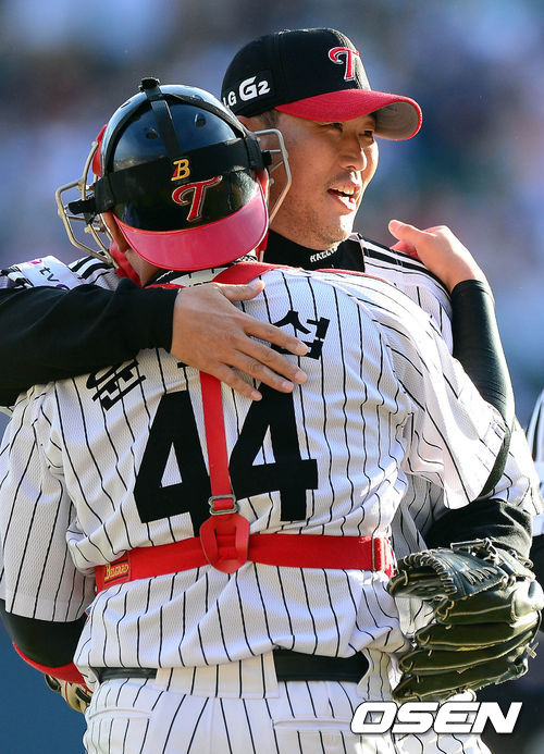 5일 오후 서울 잠실구장에서 열린 '2013 한국야쿠르트 세븐 프로야구' LG 트윈스와 두산 베어스의 경기 시작전 시구를 마친 최동수가 윤요섭과 포옹을 하고 있다.