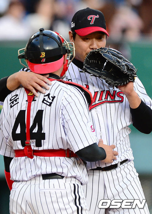 5일 오후 서울 잠실구장에서 열린 '2013 한국야쿠르트 세븐 프로야구' LG 트윈스와 두산 베어스의 경기 4회초 2사 이원석에게 좌중간 2루타를 허용한 류제국이 윤요섭과 이야기를 나누고 있다.