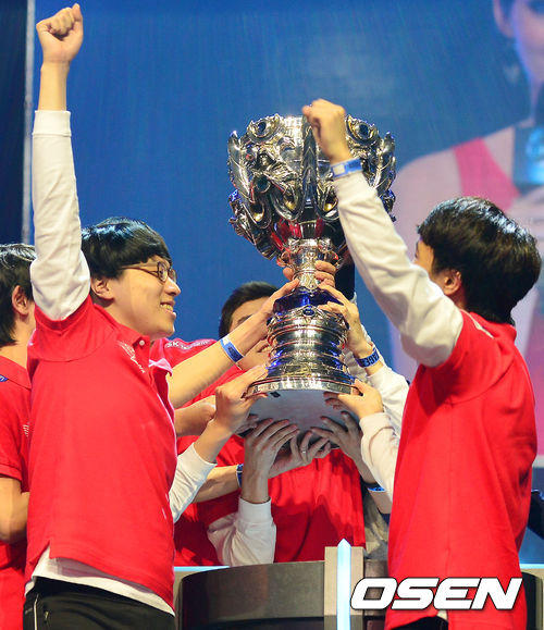경기 종료후 SK텔레콤 T1 선수들이 우승컵을 들어올리고 있다./ rumi@osen.co.kr