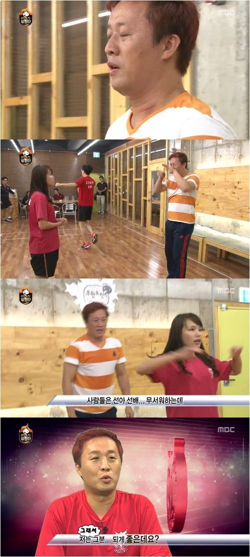 이날 정준하는 여자 선배인 ‘선아 선배’의 한마디에 기가 죽고 푹퐁 교육에 잔뜩 긴장했다. 하하 역시 ‘선아 선배’의 공포 교육에 벌벌 떨었다.