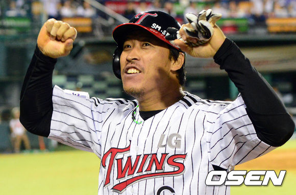 5일 오후 서울 잠실구장에서 열린 '2013 한국야쿠르트 세븐 프로야구' LG 트윈스와 두산 베어스의 경기 6회말 2사 3루 김용의의 번트에 득점에 성공한 이병규가 환호하고 있다.