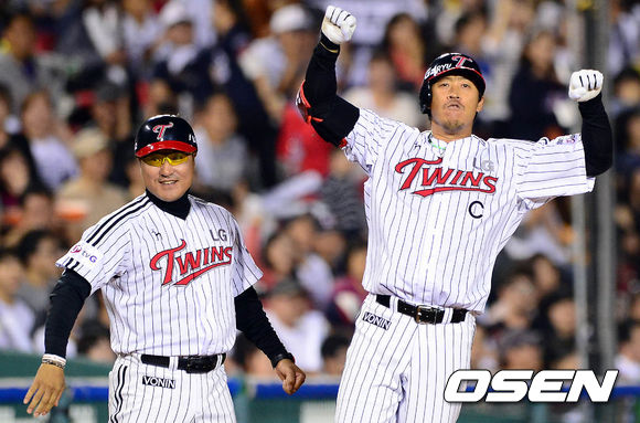 5일 오후 서울 잠실구장에서 열린 '2013 한국야쿠르트 세븐 프로야구' LG 트윈스와 두산 베어스의 경기 6회말 2사 1,3루 이병규가 2타점 3루타를 치고 환호하고 있다.