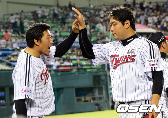 5일 오후 서울 잠실구장에서 열린 '2013 한국야쿠르트 세븐 프로야구' LG 트윈스와 두산 베어스의 경기 7회초 1사 1루 양의지를 병살로 처리하며 7이닝을 마친 류제국이 덕아웃으로 향하며 이병규와 하이파이브를 하고 있다.