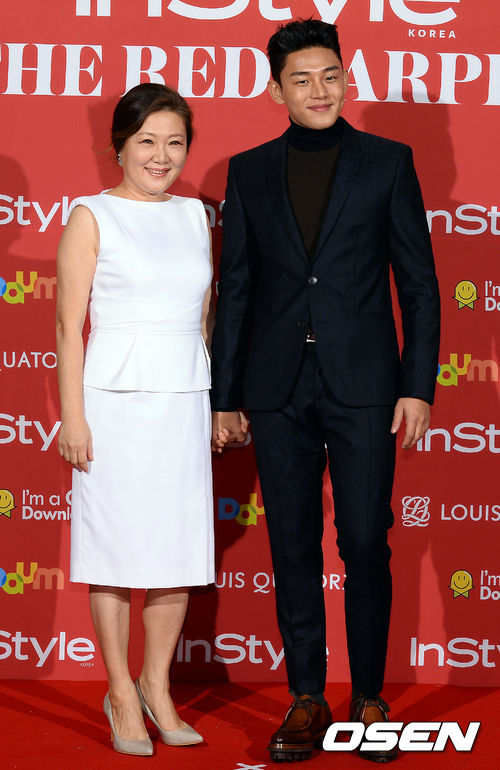 유아인과 김해숙이 포토타임을 갖고 있다.