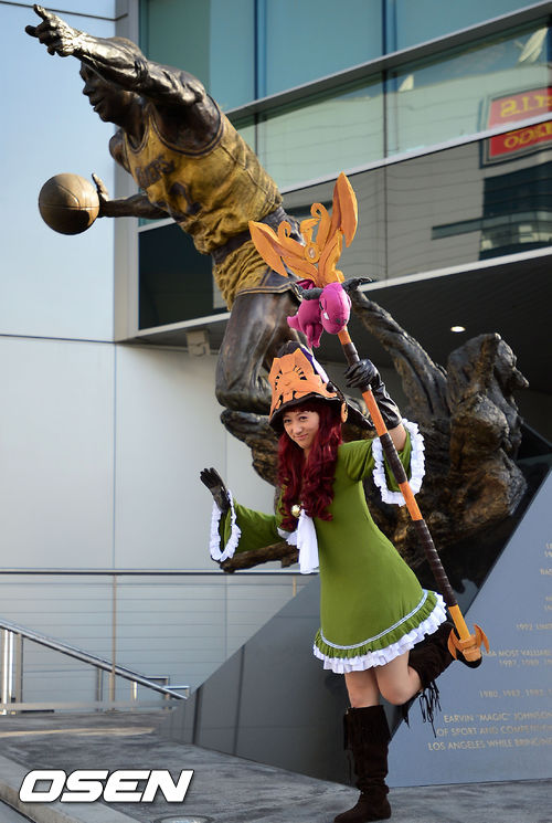 롤드컵 결승전 코스프레 행사에서 룰루 코스프레를 한 여성이 스테이플스 센터에 있는 매직 존슨의 동상과 같은 포즈를 취하고 있다./ rumi@osen.co.kr