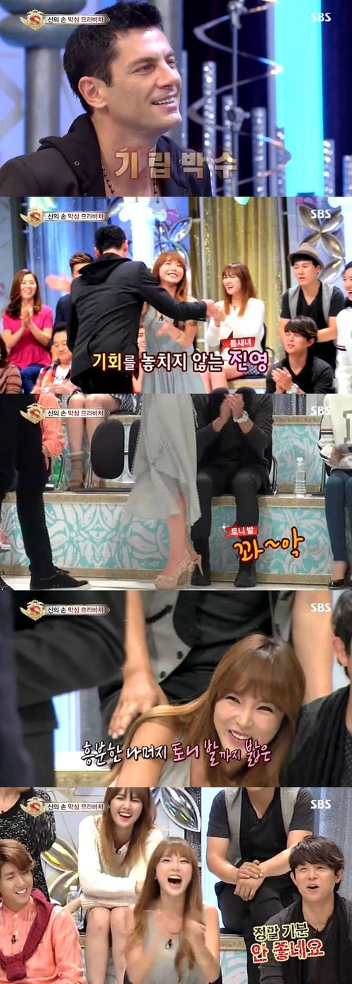 그러나 막심과의 포옹에 취한 나머지 모르고 토니안의 발까지 구두의 힐로 밟는 상황까지 벌어져 웃음을 자아냈다. 막심과 극과 극 대접을 받은 토니안은 "정말 기분 안좋네요"라고 말해 출연진을 폭소케 했다.