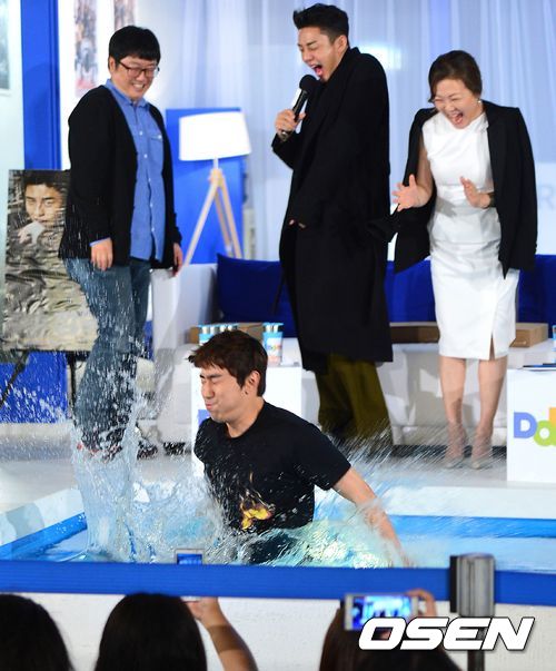 배우 이시언이 행사장에 마련된 간이 풀장에 뛰어들고 있다.