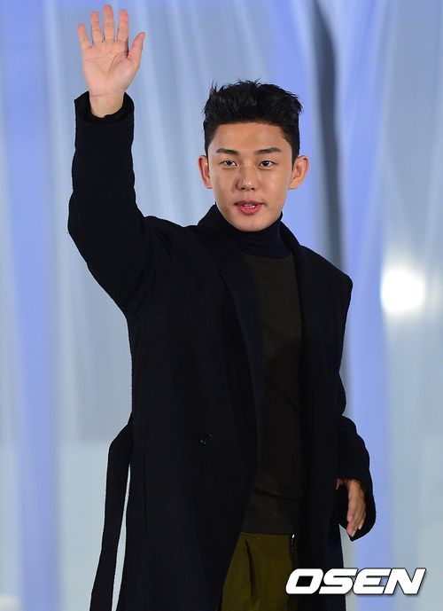 배우 유아인이 팬들에게 인사하고 있다.