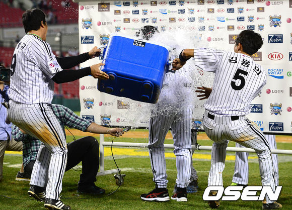 5일 오후 서울 잠실구장에서 열린 '2013 한국야쿠르트 세븐 프로야구' LG 트윈스와 두산 베어스의 경기 종료 후 김기태 감독이 인터뷰 중 이병규, 김용의로부터 물세례를 받고 있다.